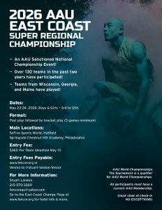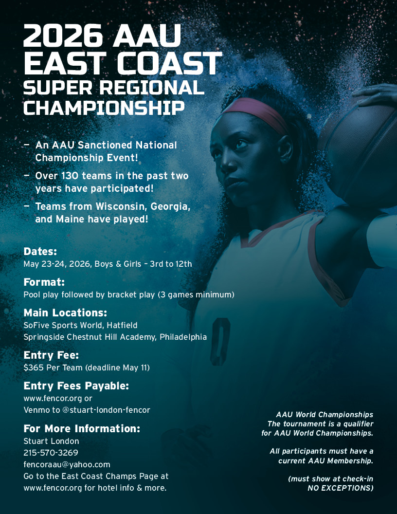 Fencor is proud to announce that it has been awarded the 2026 AAU NRS Eastern Conference Championships for Girls and the East Coast Super Regional for Boys. It will be held May 23-24, 2026 in Philadelphia. There have been 175 teams from as far away as Wisconsin, Ohio, Michigan, Maine and North Carolina that have participated in the past five years.